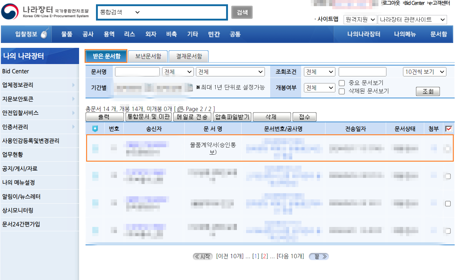 : 받은문서함에서 기간별로 물품계약서 조회 후 관련 검사검수요청서가 필요한 계약서 클릭