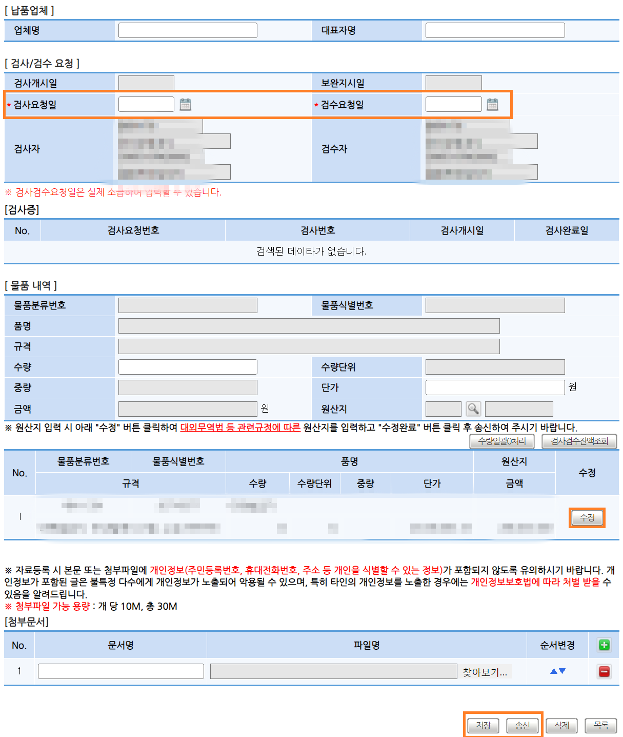 ① *검사요청일, * 검수요청일: 일반적으로 납품일 날짜로 한다는데 난 작성일자로 요청일자 적어냄.