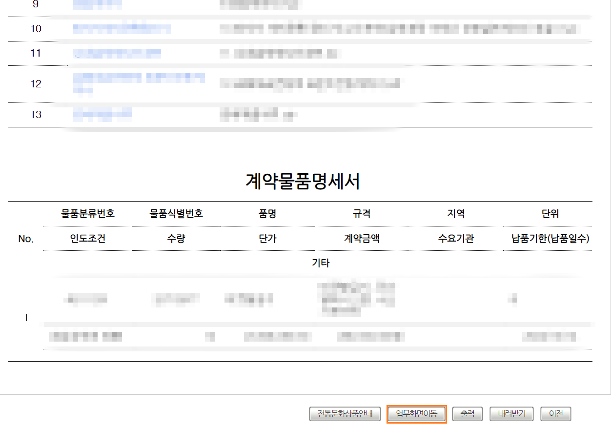 : 계약서 화면 이동 후 하단에 업무화면 이동 클릭