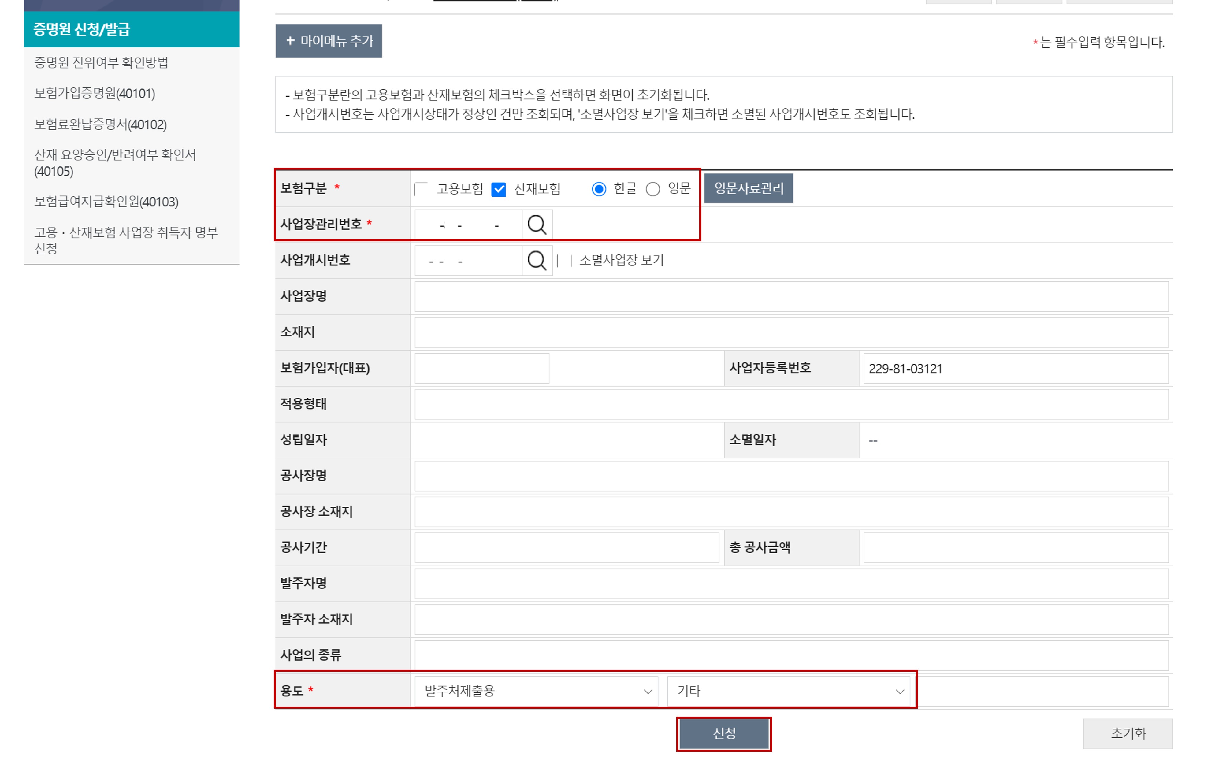필수입력항목 작성 후 신청 버튼을 클릭하면 발급 가능하다.