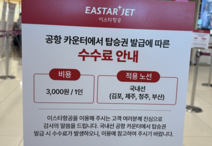 ✈️ LCC 국내선, 공항 카운터 발권 ‘추가요금’ 시작된다최근 국내 저비용항공사(LCC)들이 국내선 공항 카운터에서 탑승권을 발급받는 승객에게 1인당 약 3,000원의 수수료를 부과하기로 했습니다.셀프 체크인이나 온라인 발권은 무료인 반면, 직원 카운터 발급은 추가 비용을 내야 합니다~ 이스타항공은 2025년 10월 13일부터 서울 김포·청주·제주·부산(김해) 공항 국내선 공항 카운터에서 탑승권을 발급받는 승객에게 1인당 3,000원 수수료 를 부과하기로 했는데요해당 조치는 온라인 혹은 키오스크(셀프) 체크인 이용 시에는 수수료 없음 으로 설계되어 있으며, 승객이 셀프 수속 방식을 이용하도록 유도하고 있습니다. 항공사들은 고정비용이 크고 경쟁이 심화된 현재, 운영 효율화 및 인건비 절감이 필요한 시점..